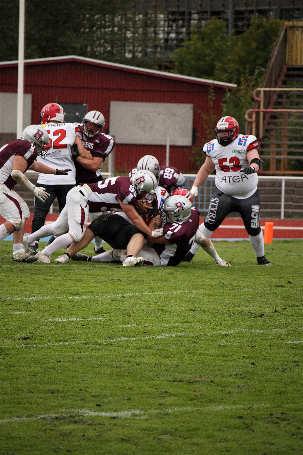 Under lördagen spelades returmatch mot Carlstad Crusaders på hemmaplan. Det var en hård och väldigt fysisk match som två lag med tunnare trupper än vanligt drabbade samman i. Vi fick dessutom två tidiga utvisningar och en hjärnskakning vilket gjorde att vi fick sätta in spelare på ovana positioner och vilan blev liten eller ingen. Vi visade som många gånger förut att vi aldrig ger upp och spelar hela vägen för varandra och gick vinnande ur striden. Resultatet skrevs till 30-6 och vi leder nu serien med två matcher kvar att spela.